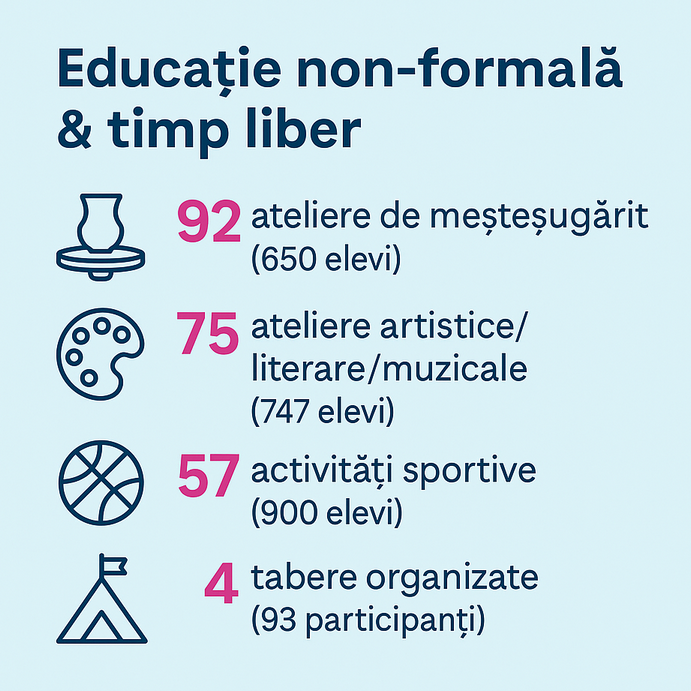 Ateliere de pictură, literatură, muzică și creație Cu 747 de participanți, aceste ateliere au contribuit la dezvoltarea expresivității artistice și a interesului pentru cultură. Elevii au desenat, au pictat pe diverse suprafețe, au citit și analizat texte, au scris poezii sau scrisori și au recitat din creații proprii sau din autori români. De asemenea, au participat la serbări, activități muzicale, audiții și au vizitat muzee sau instituții culturale locale.