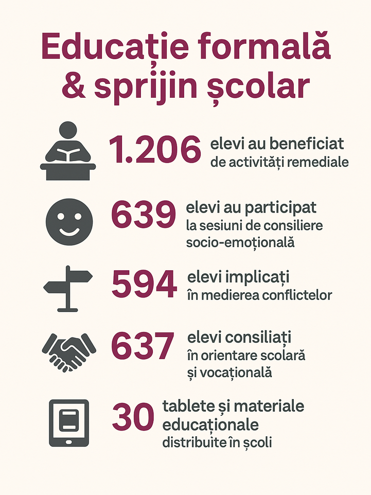 Elevii au participat la sesiuni de educație formală desfășurate în cadrul programului „Școală după școală”, cu accent pe consiliere individuală și de grup, dezvoltarea abilităților socio-emoționale, sprijin remedial la disciplinele școlare, orientare vocațională și medierea conflictelor. Aceste sesiuni au fost adaptate nevoilor fiecărei școli și fiecărui beneficiar.