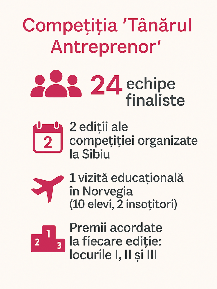 Desfășurarea competiției „Tânărul Antreprenor” Competiția s-a desfășurat în două ediții anuale, în fiecare dintre ele având loc câte două etape: una preliminară la nivelul fiecărei școli și o etapă finală cu jurizare externă, organizată la Sibiu.