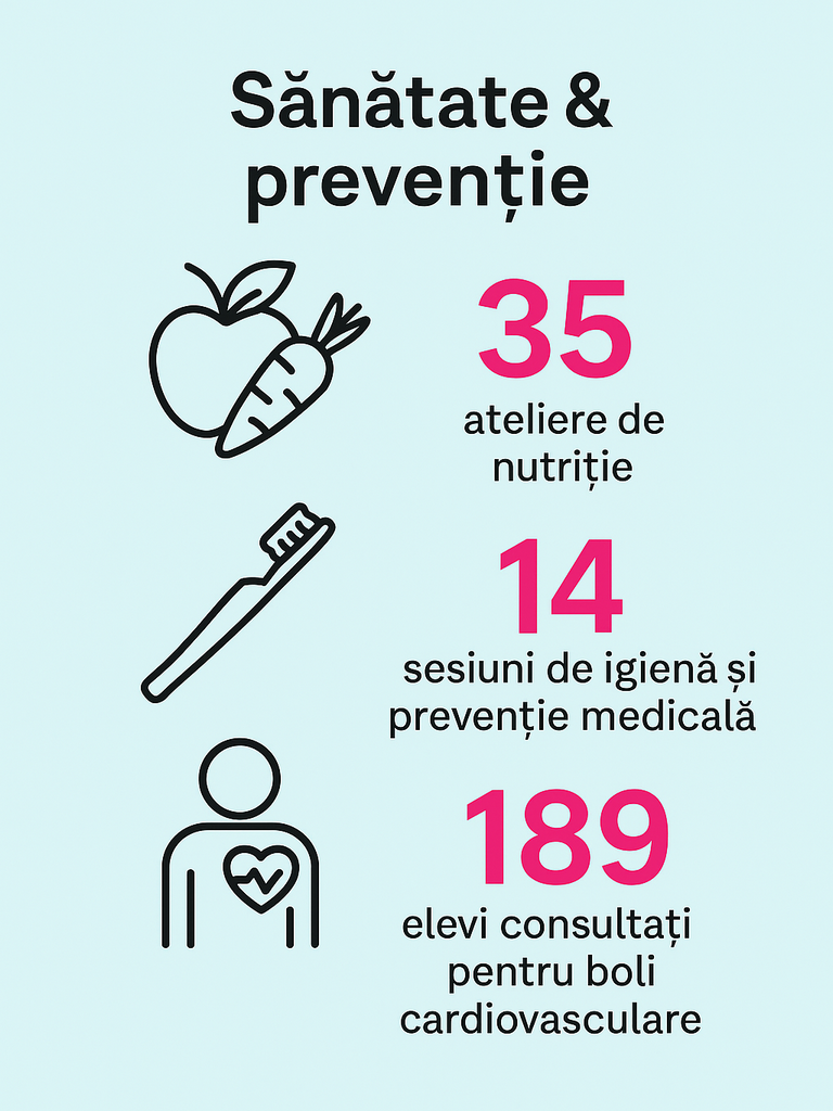 Această activitate a urmărit susținerea stării de sănătate a elevilor și prevenirea riscurilor medicale care pot influența negativ participarea școlară, printr-un set de intervenții educaționale și preventive. Activitatea s-a desfășurat începând cu luna 16 a proiectului și a inclus: ateliere tematice de nutriție, sesiuni educaționale despre igienă și prevenție medicală, precum și consultații specifice de screening cardiovascular.