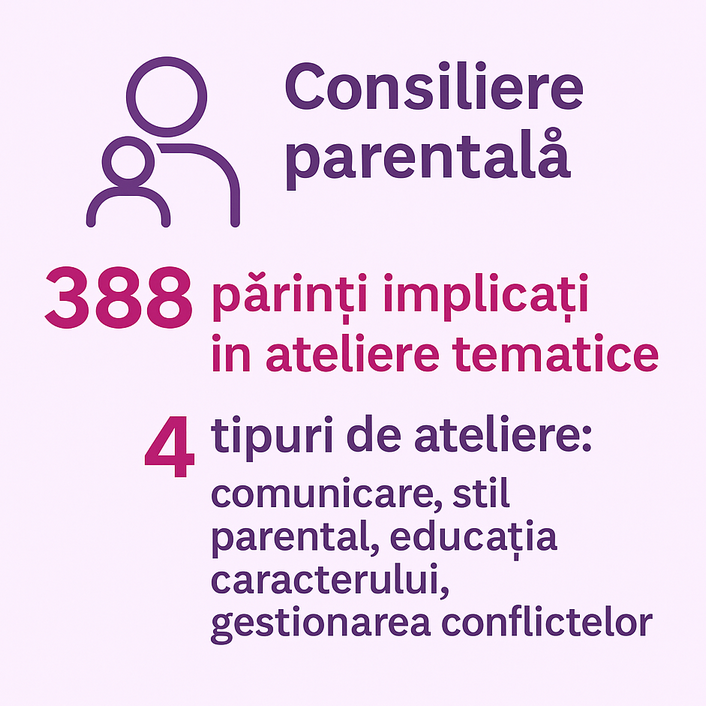 Ateliere de comunicare în familie Au sprijinit părinții în identificarea stilurilor de comunicare utilizate acasă și au oferit instrumente pentru îmbunătățirea dialogului cu copiii. S-au abordat teme precum gestionarea timpului petrecut în fața ecranelor, prevenirea violenței școlare prin comunicare activă și înțelegerea nevoilor emoționale ale copiilor. Activitățile au inclus discuții aplicate, chestionare, exemple de bune practici și exerciții de reflecție.